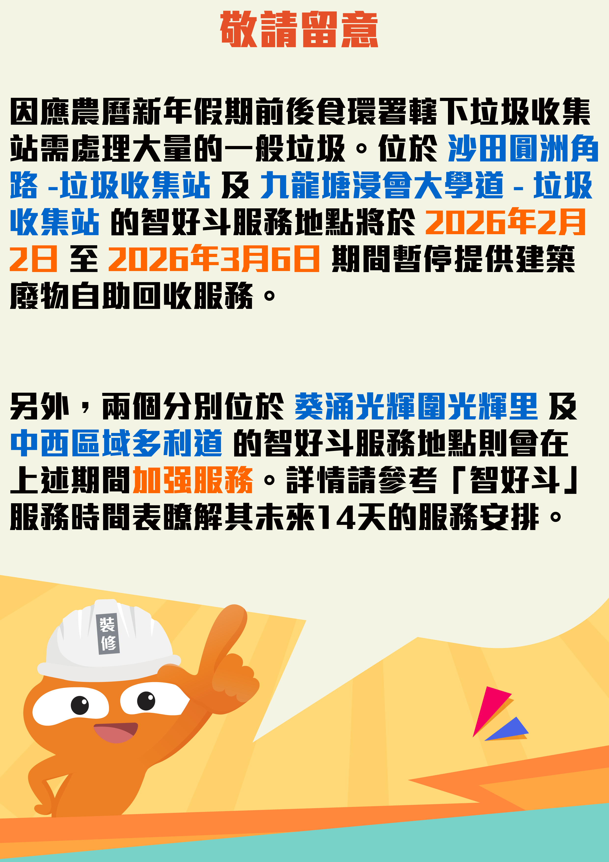 的智好斗服務地點將於2026年2月2日至2026年3月6日期間暫停提供建築廢物自助回收服務。