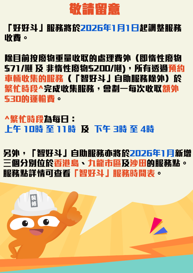 「好好斗」服務將於2026年1月1日起調整服務收費。除目前按廢物重量收取的處理費外(即惰性廢物$71/噸 及 非惰性廢物$200/噸),所有透過預約車輛收集的服務(「智好斗」自助服務除外)於繁忙時段^完成收集服務,會劃一每次收取額外$30的運輸費。